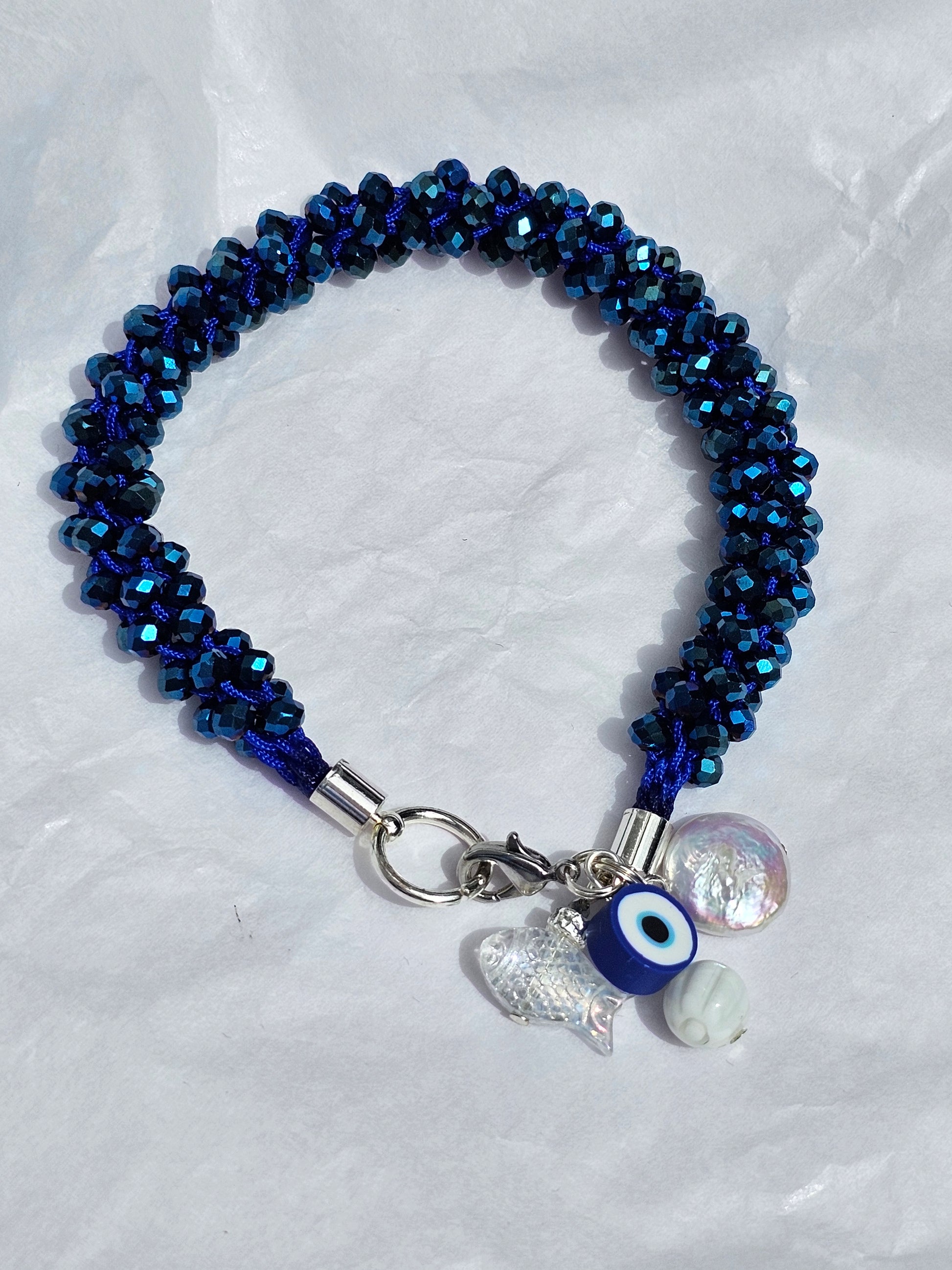 Pearl charm,evil eye charm, glass fish charms,silver plated fixings. Blue crystal kumihimo bracelet.