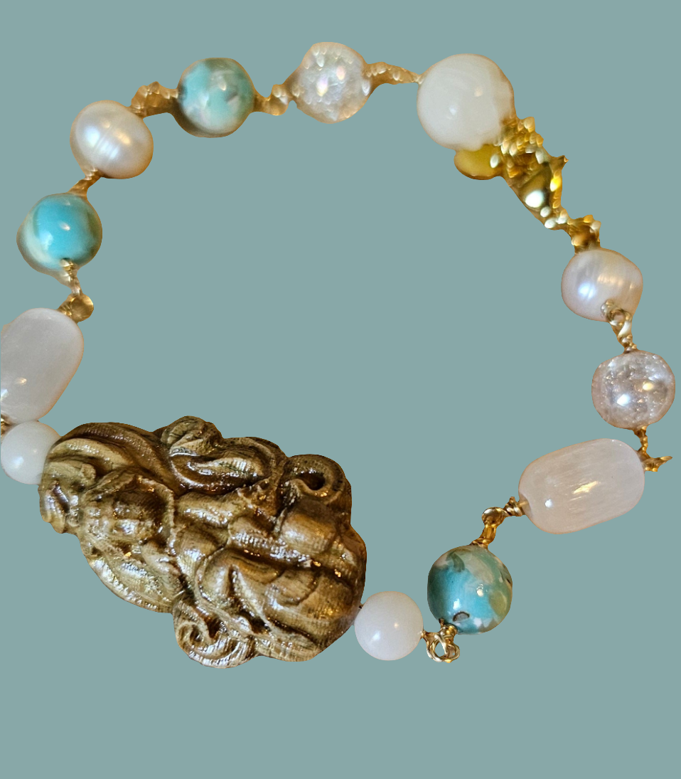 Made with Wood Carved fox goddess bead,natural selinte, crackled glass,dyed blue natural Mother of pearls beads, bohdi Lotus bead on gold plated copper wire.